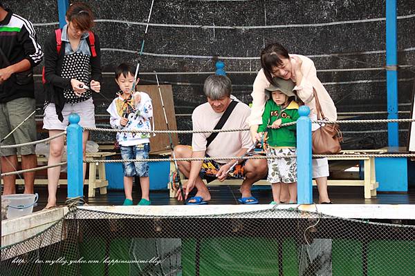 開始釣魚囉~倆小覺得超級好玩的,這裡的魚桿沒有魚鉤,要自己打個結把魚塊綁住