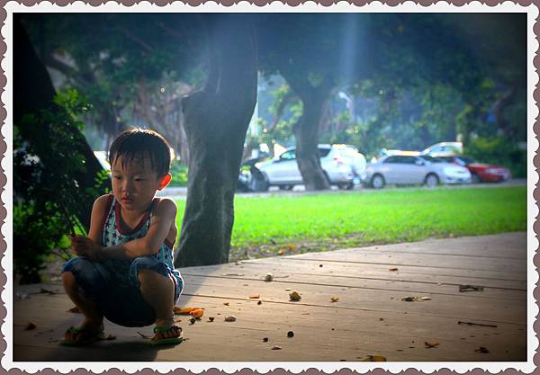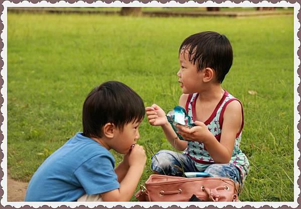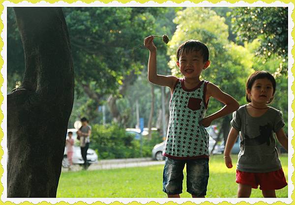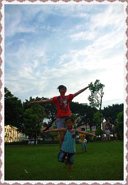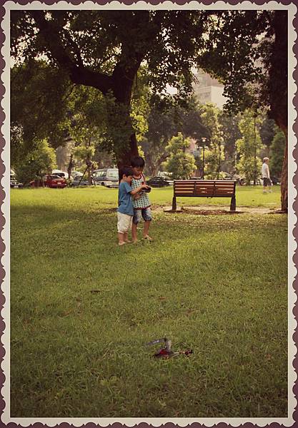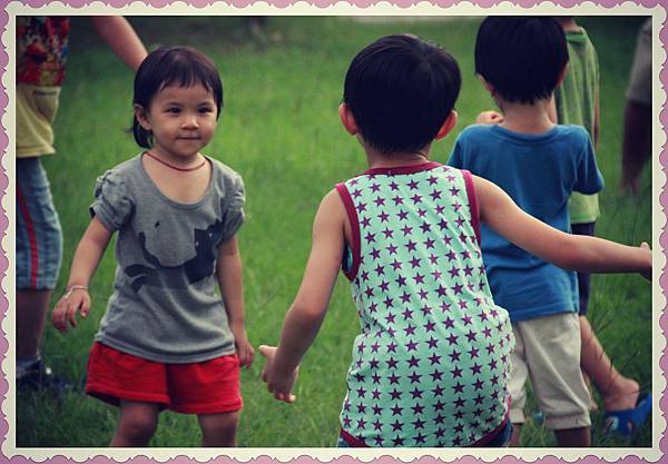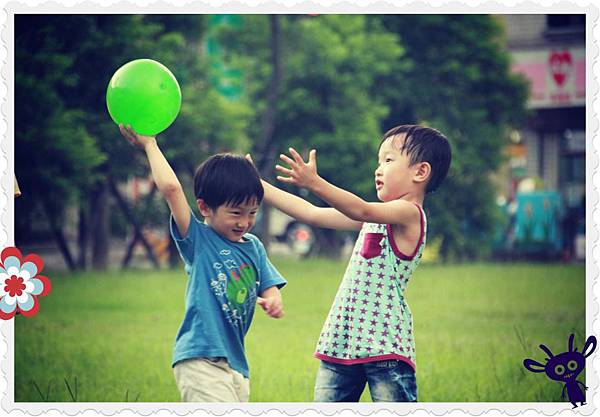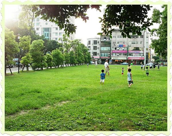 原來是草皮那有小朋友在玩球,慢慢地就加入一塊玩