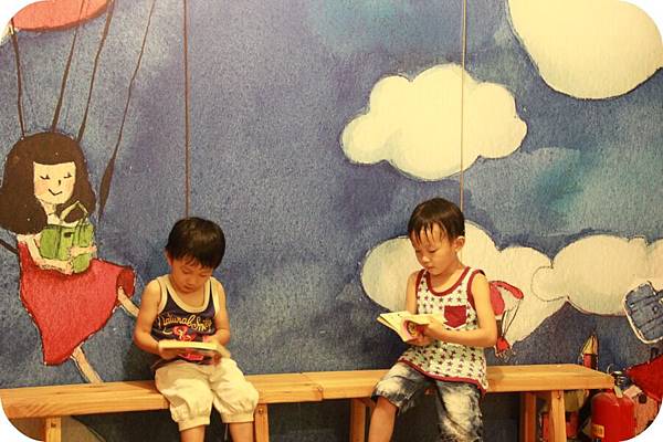 後來拔拔也帶著兩小進屋看漫畫囉~不過兩小也很會做樣子,因為他們根本就看不懂吧 XD