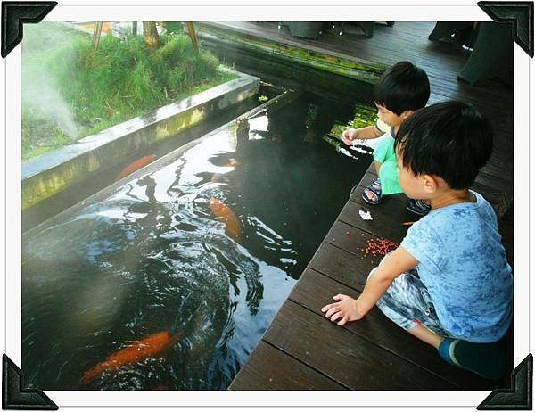 找個魚池邊的位置坐好,高先生叫我先問服務生可以餵魚嗎??