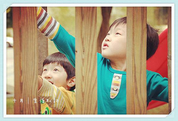 社區在做自來水水管工程,兩小就這樣看著樓下的工程車忙忙碌碌的工作著.....