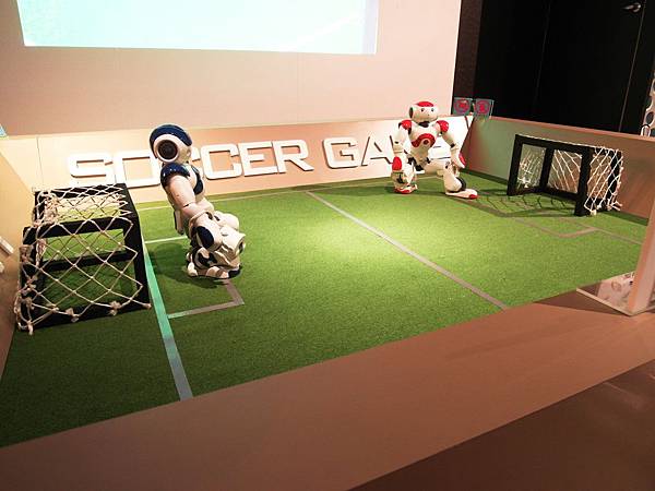 機器人NAO踢足球,但是現在不適表演時間....NAO一動也不動XD